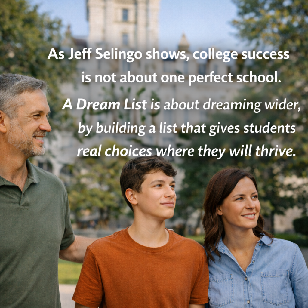 Most families do not set out to create stress around college admissions. It happens gradually. A student mentions a school they admire. A ranking reinforces it. A conversation with another family sharpens the focus. Before long, that school becomes the story. Jeff Selingo’s book Dream School: Finding the College That’s Right for You offers an important reminder. The real goal of the college search is not landing one specific name. It is finding environments where a student can grow, feel supported, and build momentum over four years. Thriving is the outcome worth protecting.