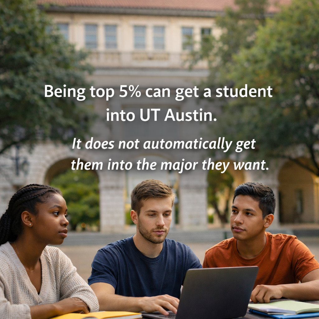 Many families believe being in the top 5% makes UT Austin a sure thing. It does not. Auto admit guarantees admission to the university, not to competitive majors like engineering, business, or computer science. Each year, top 5% students are denied their intended major because they misunderstand how UT actually works. See what this year's UT admissions decisions reveal about major-level selectivity.