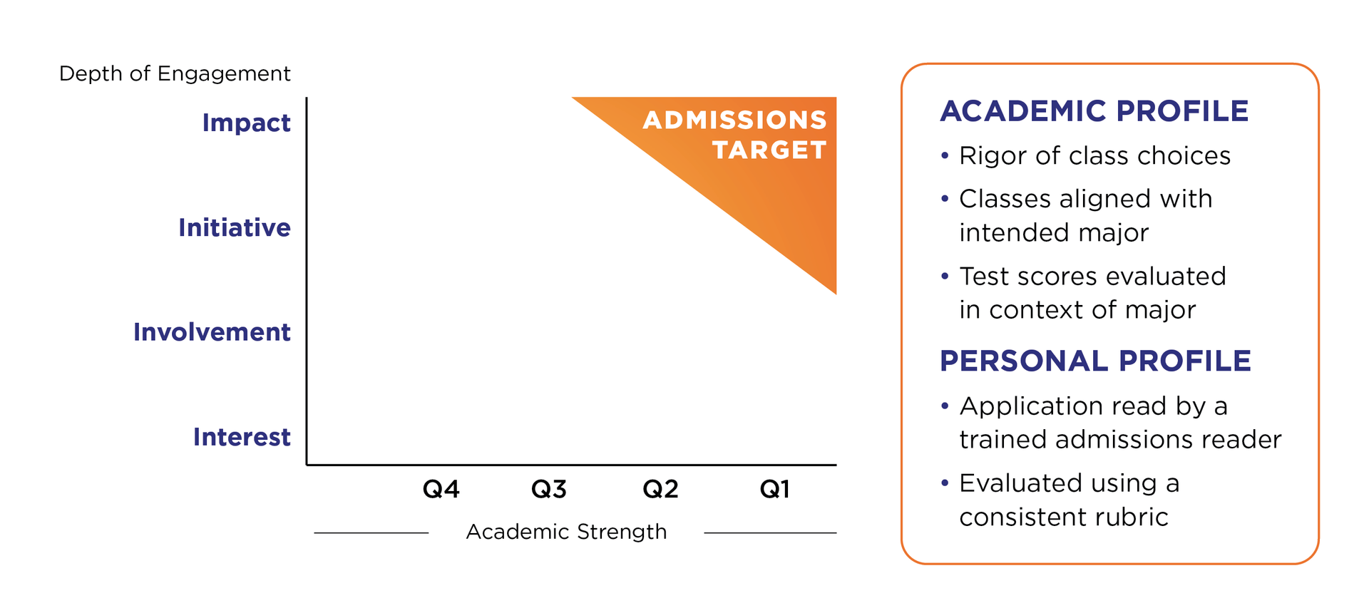 GPA, test scores, essays, and the expanded resume are all read through that specific lens.